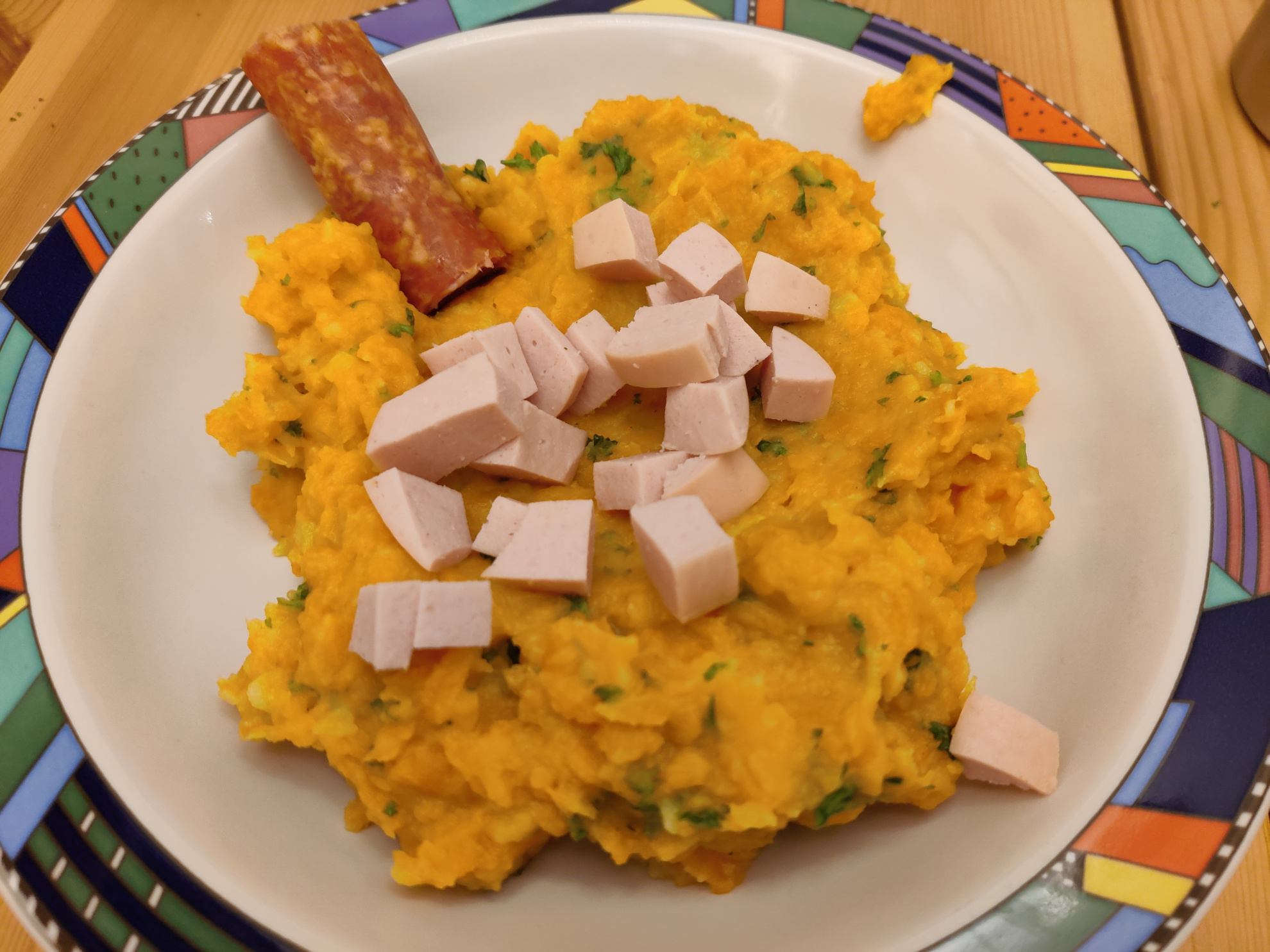 Wenn das Gemüse durch ist, das Wasser abgießen, die Butter mit in den Topf geben und alles gut durchstampfen, bis es eine breiige Konsistenz bekommt. Am Ende die Petersilie reingeben, gut umrühren und mit dem Kräutersalz abschmecken.